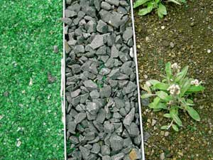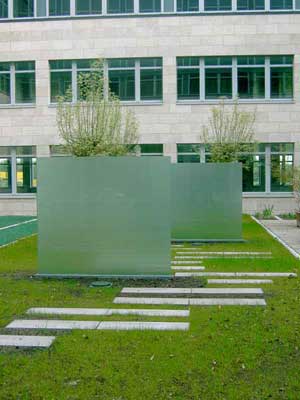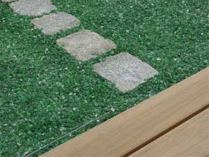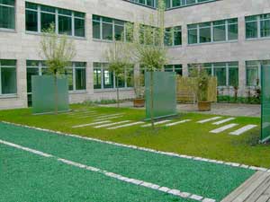 Grünes Glasgranulat korrespondiert mit der Farbe der Glaswände, unterstreicht die Einheit vertikaler und horizontaler Strukturen.