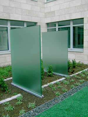 Gläserne Wände als Sichtschutz- und Gliederungselemente. Die satinierte Oberfläche ist lichtdurchlässig, schützt aber vor Einblicken.