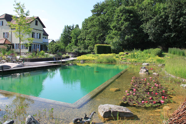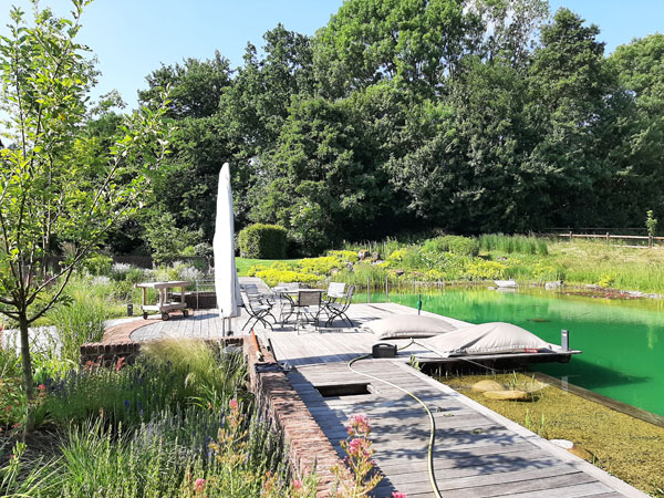 Der vorhandene Pool wurde behutsam in die Gestaltung eingebunden. Seine naturnahen Randbereiche und ein angrenzendes Holzdeck mit Sitzgruppe fügen sich harmonisch in das Gesamtensemble ein. So entstand ein Garten, der Naturverbundenheit, Lebensfreude und Gestaltung auf besondere Weise vereint.