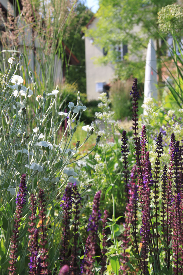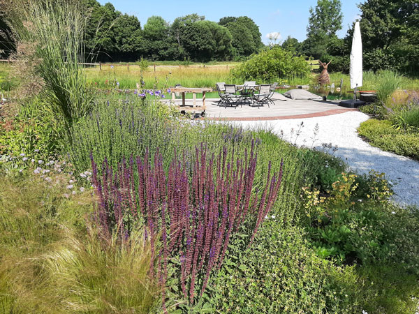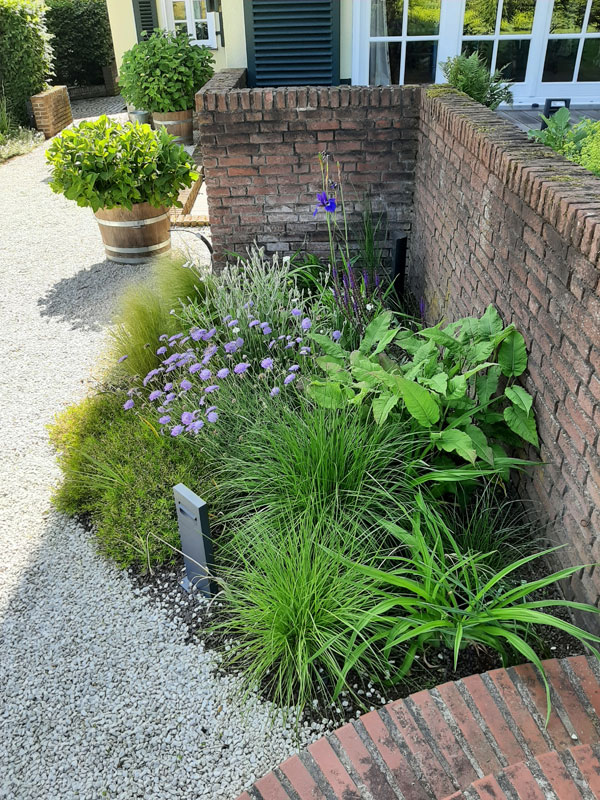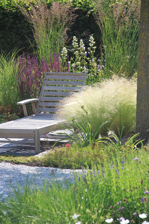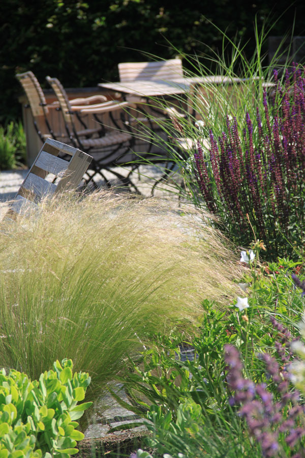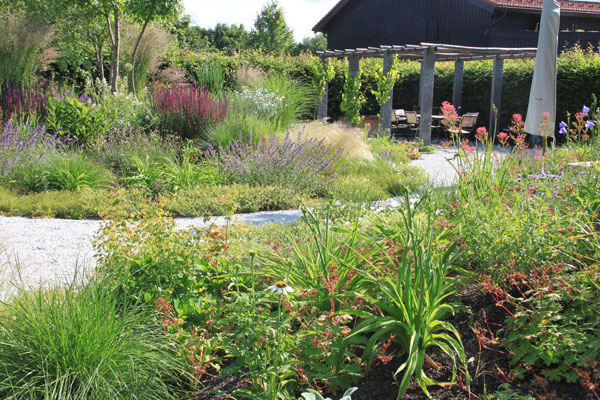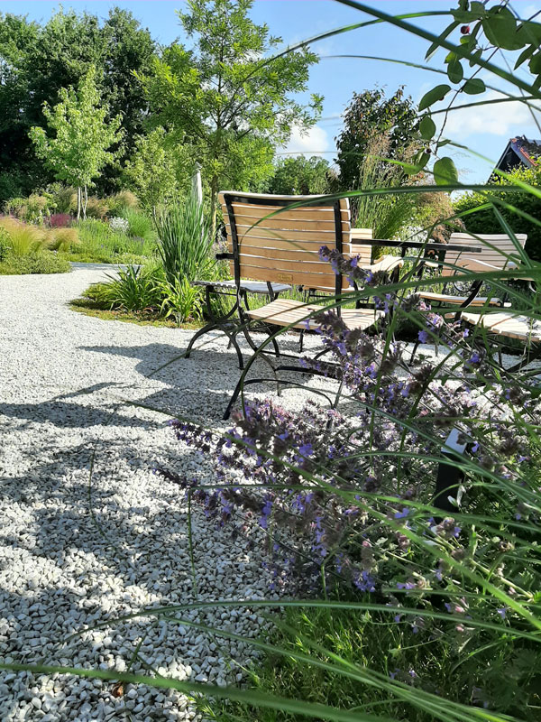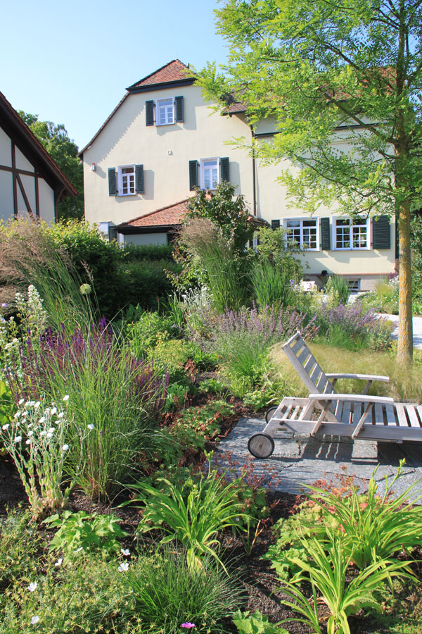 Ein lebendiger Garten, der durch seine vielfältige Bepflanzung, geschwungene Wege und liebevoll gestaltete Details überzeugt. Üppige Stauden, Gräser und Gehölze schaffen ein buntes, sich wandelndes Bild mit hoher Aufenthaltsqualität.
