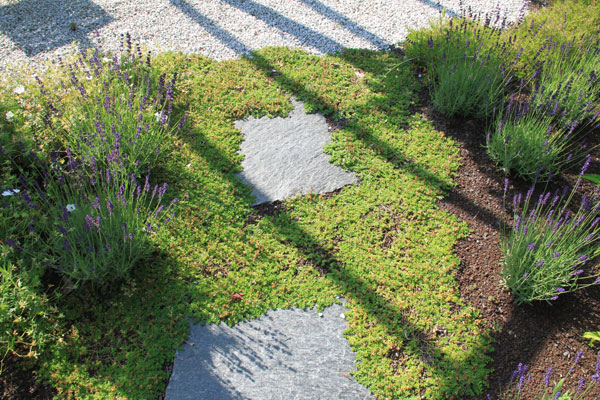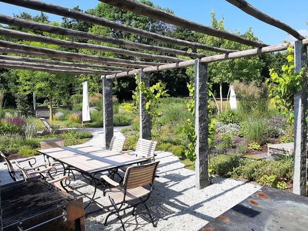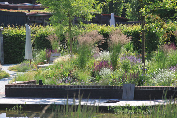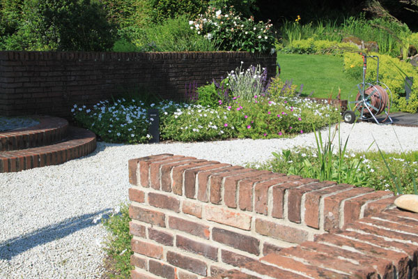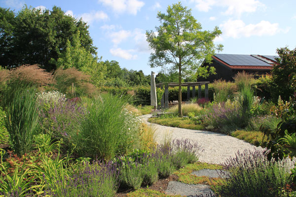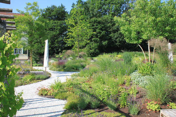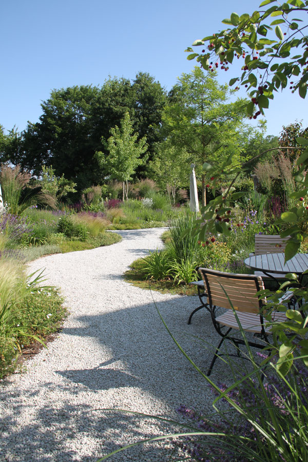 Die sanften Wegführungen verbinden großzügige Pflanzflächen mit ruhigen Rückzugsorten. Materialien wie Backstein und unbehandeltes Holz verleihen dem Garten eine warme, natürliche Anmutung.