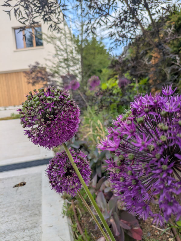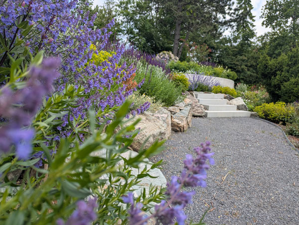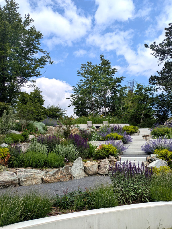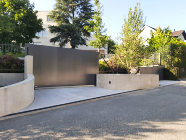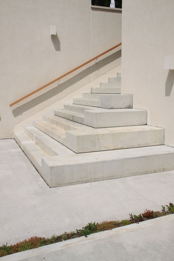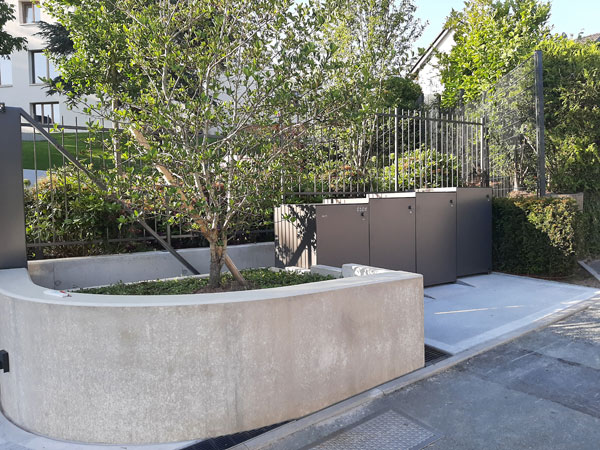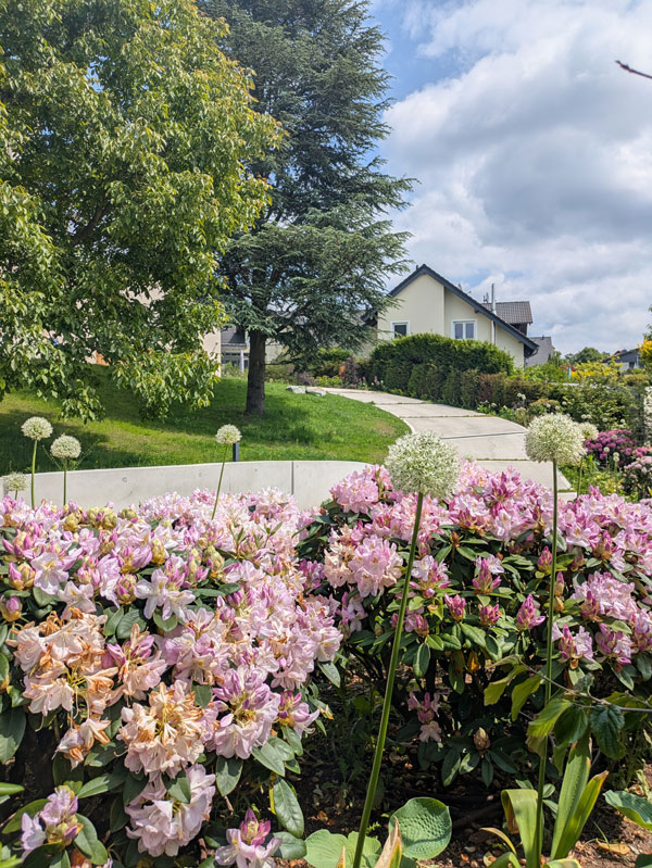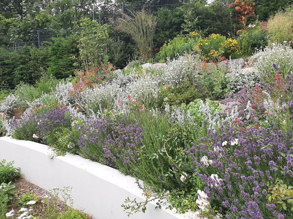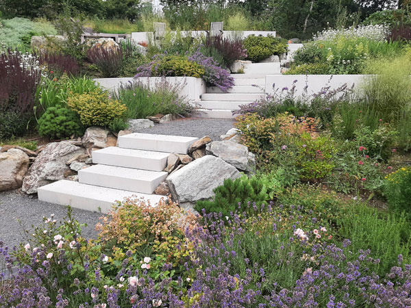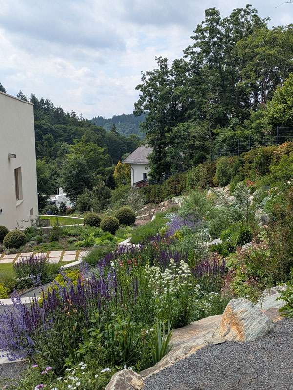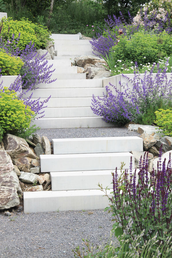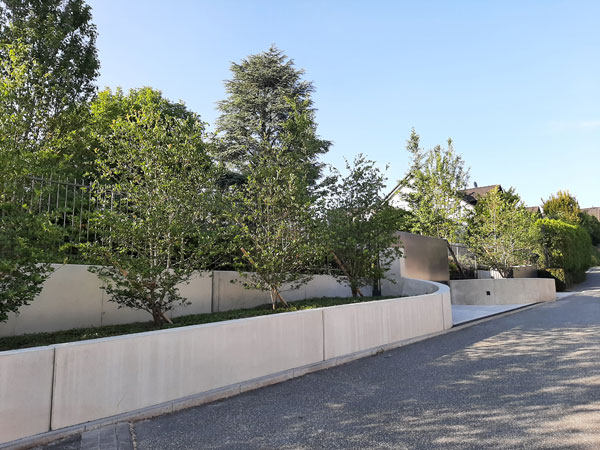 Der Garten dieser modernen Villa vereint Eleganz und Natur. Das Großzügige Grundstück wird durch seine Hanglage bestimmt. Geschwungene Sichtbetonmauern terrassieren das gelände, schaffen Platz für üppige Staudenbepflanzungen. Ortbeton der Mauern verleiht dem Garten ein cleanes Finish, die Pflanzungen durchbrechen diese schlichte Eleganz, erzeugen Spannung und strahlen natürliche Lebenslust aus. Beton wurde auch für die lange Zufahrt verwendet. Die Fläche wird unterbrochen von breiten, bepflanzten Fugen (‘Betonschollen’), die Besenstrich-optik ruft eine feine, raue Textur hervor.