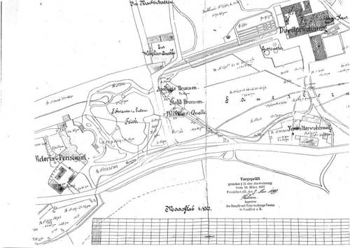 'Als ich im Jahre 1818 als Physikus nach Cronberg versetzt wurde, war das Tal öde. Die sumpfigen Wiesen trugen nur Schilf und Rohr. Ein schmaler, kaum zugänglicher Fußpfad führte an dem städtischen Sauerbrunnen vorbei. Die Stelle, wo jetzt die Stahlquelle zu Tage kommt, konnte nur im Sommer bei anhaltender trockener Witterung betreten werden; ebenso die Umgebung der Wilhelmsquelle, welche bei dem geringen Werthe der Wiesen nur von einem offen gehalten wurde, dem sie im Sommer einen wertvollen Beitrag zu seiner Wasserkraft leistete ...'