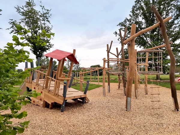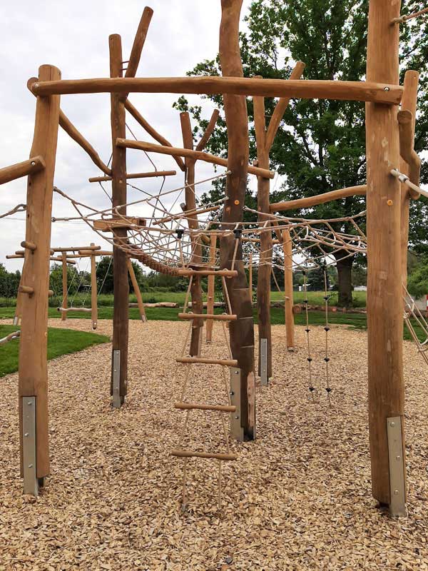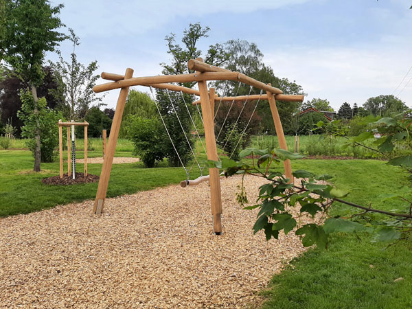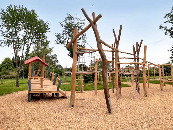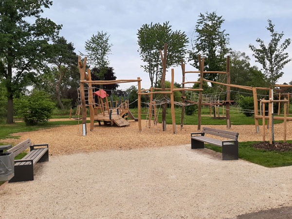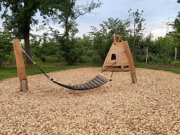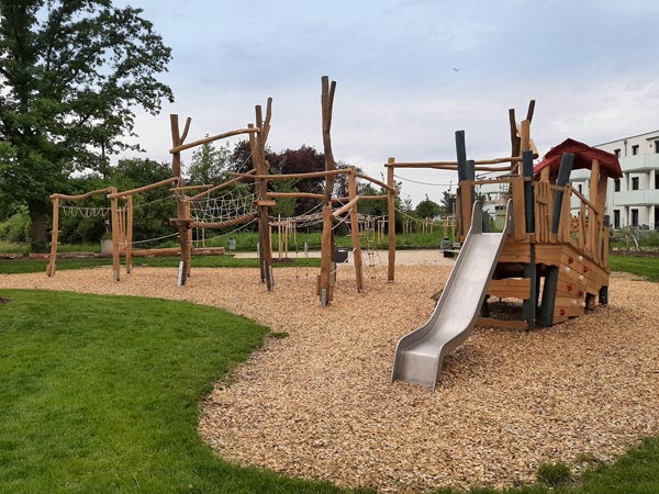 In Korrespondenz mit dem nahe gelegenen Spielplatz Mitte bietet diese Kletter- und Spielwelt am Rand des städtischen Entwicklungsgebietes gerade für die größeren der ‚Kleinen‘ ein weites Feld zum Austoben sowie zum Testen der eigenen ‚Hochseiltauglichkeit‘. Aber auch die eine oder andere Ecke zum Rückzug vom Trubel wird geboten – das alles eingebettet in den Übergang zur umgebenden Landschaft. Verstärkt wird dieses Naturerlebnis durch die angrenzenden Wildwiesen, deren Zusammensetzung insbesondere unter dem Aspekt ihrer Blütenzusammensetzung erfolgte.