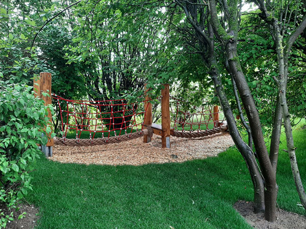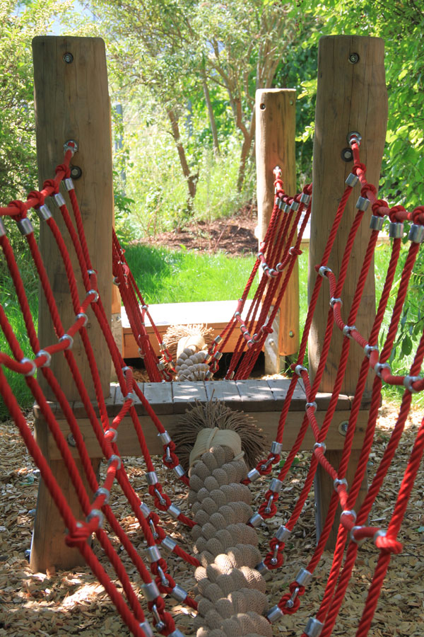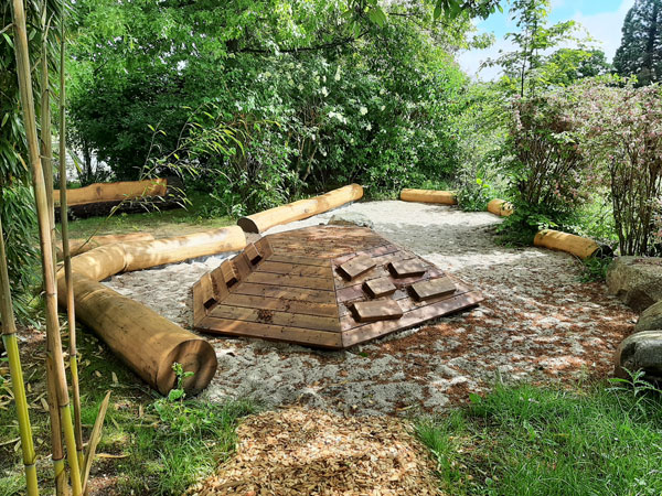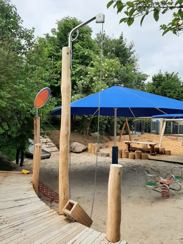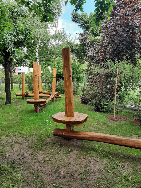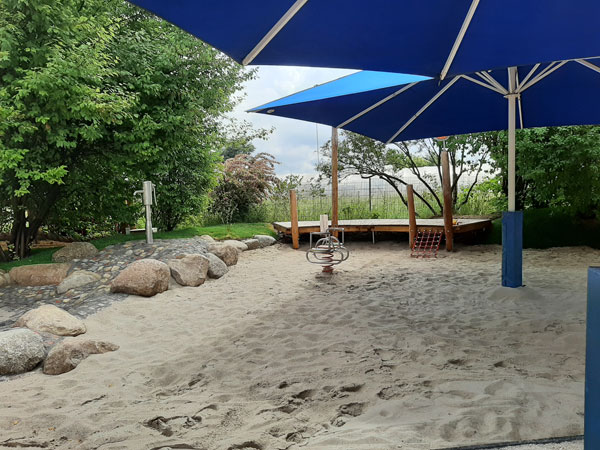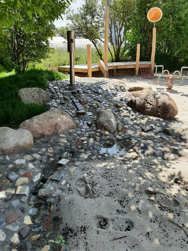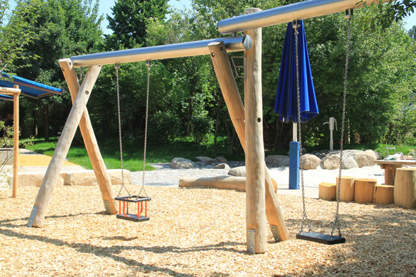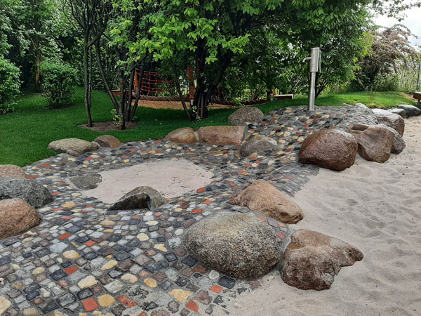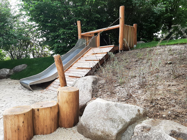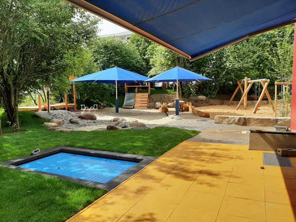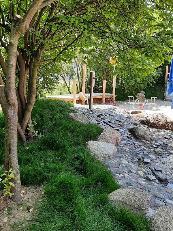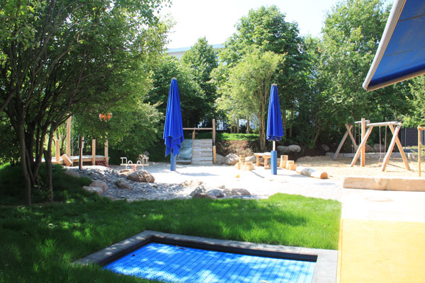 Neben Spielmöglichkeiten wie Schaukeln, Rutsche und Trampolin fördern Balancierstationen weitere motorischen Fähigkeiten, ein Sandspielbereich mit einem „Zwergenhügel“ spricht insbesonders die ganz Kleinen an. Herausstechend ist der liebevoll gestaltete Wasserspielbereich mit einer Handpumpe und mosaikverzierten Elementen. Die Spiel-Landschaft ist durch Hügel und versteckte Nischen spannend gestaltet, die den kleinen Forschern zahlreiche Entdeckungs- und Rückzugsräume bietet.