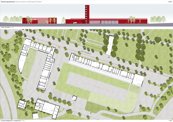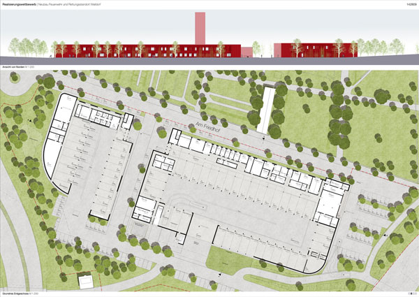 Für das neue Feuerwehr- und Rettungszentrum in Waldorf wurde ein klares, funktionales Freiraumkonzept, das die Abläufe der Einsatzkräfte optimal unterstützt vorgeschlagen. Klare, strukturierte Flächen ermöglichen eine sichere Befahrbarkeit, während grüne Inseln und ein großzügiger Innenhof für Aufenthaltsqualität sorgen.